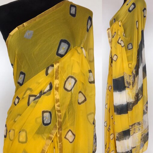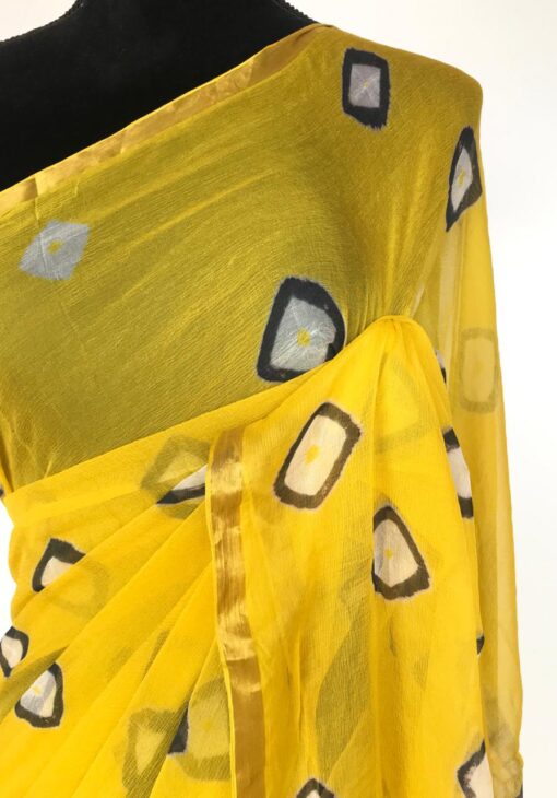 • Yellow Chiffon Saree with block prints all over