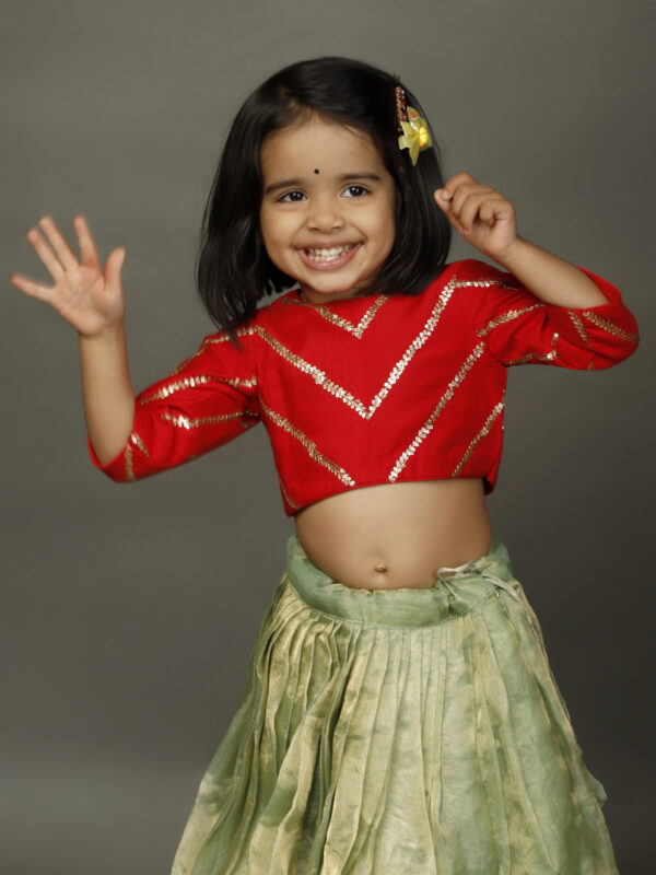 Red Sequence Top With Sea Green Tissue Silk Lehenga