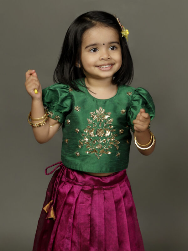 Green embroidered with magenta silk Pattu Pavadai set