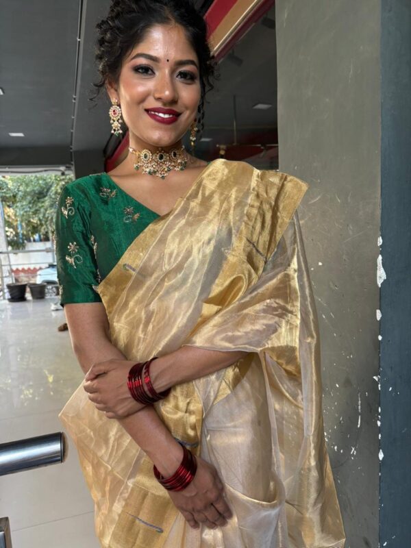 Ivory Tissue Silk Saree highlighted with Zari Motifs and Gota Border