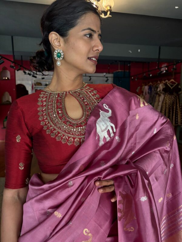 Onion Pink Handwoven Banarasi Silk Saree with Gold Silver Zari Motifs