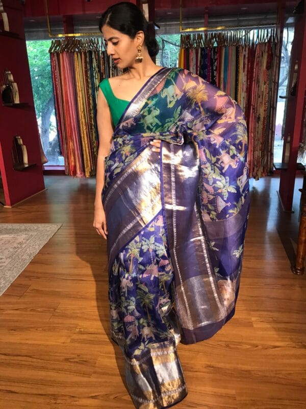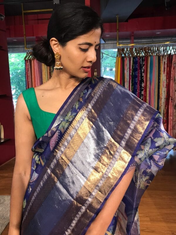 Royal Blue Printed Organza Silk Saree with Kanchi Zari Weaves